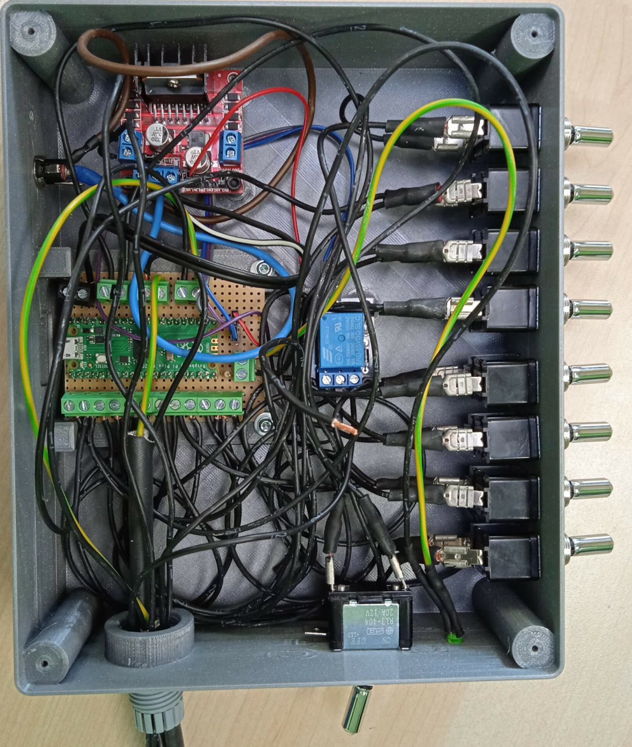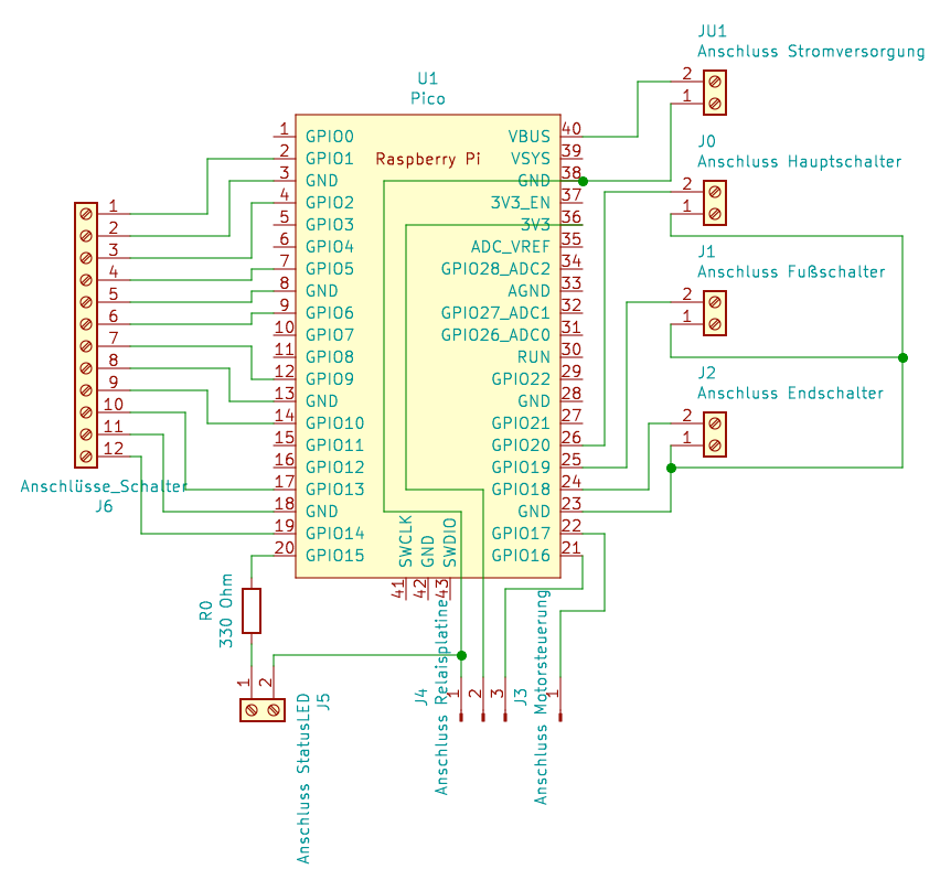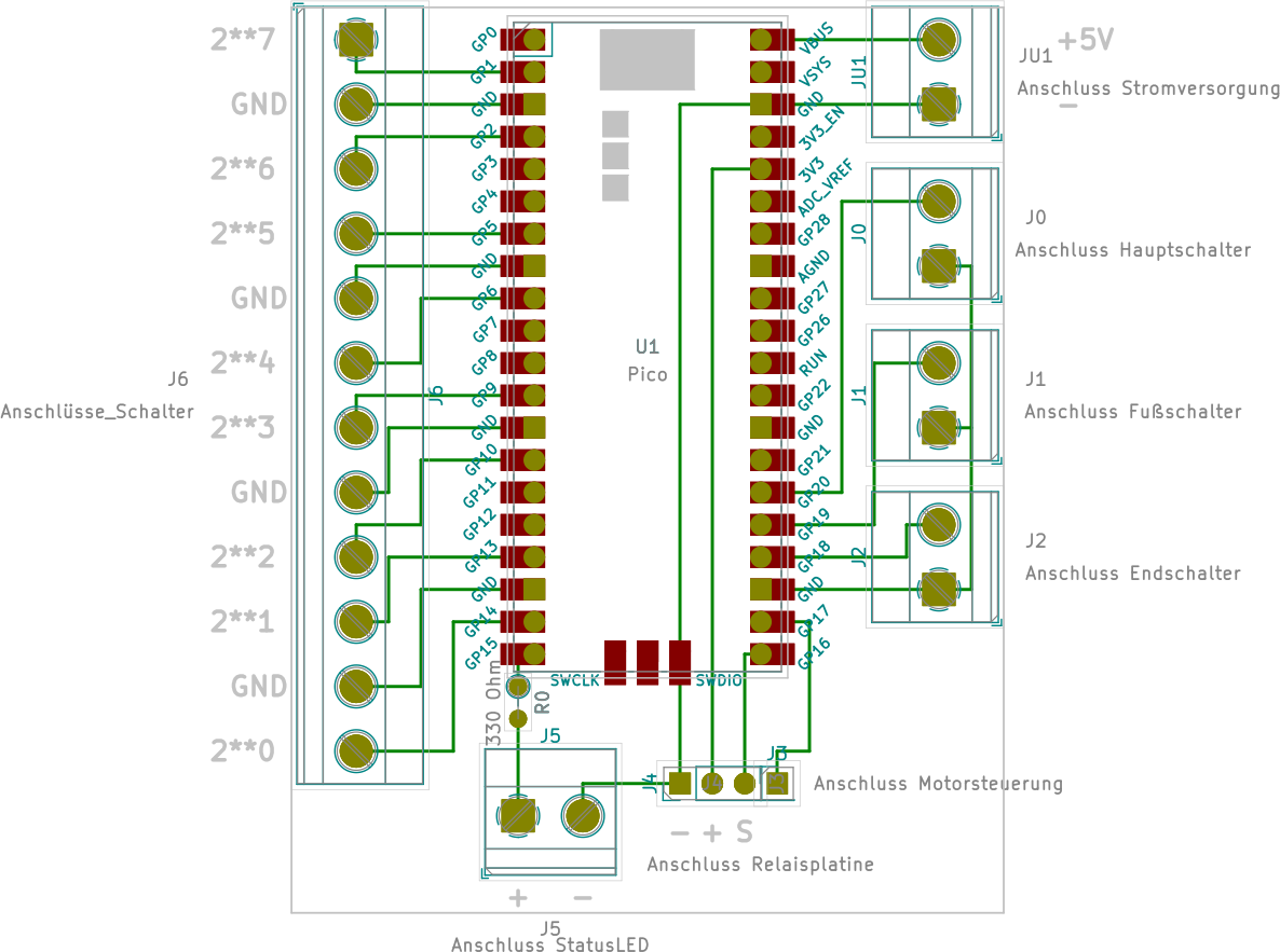Die ursprüngliche Idee dies mittels eines Raspberry Pi 4 und dem Pimoroni Explorer HAT Pro zu entwickeln wurde auf Grund der Nichtverfügbarkeit der Erweiterungsplatine verworfen. Stattdessen wurde es mit einer eigens entwickelten Platine zur Zugänglichmachung von Ein- bzw. Ausgängen auf Basis eines Raspberry Pi Pico realisiert.